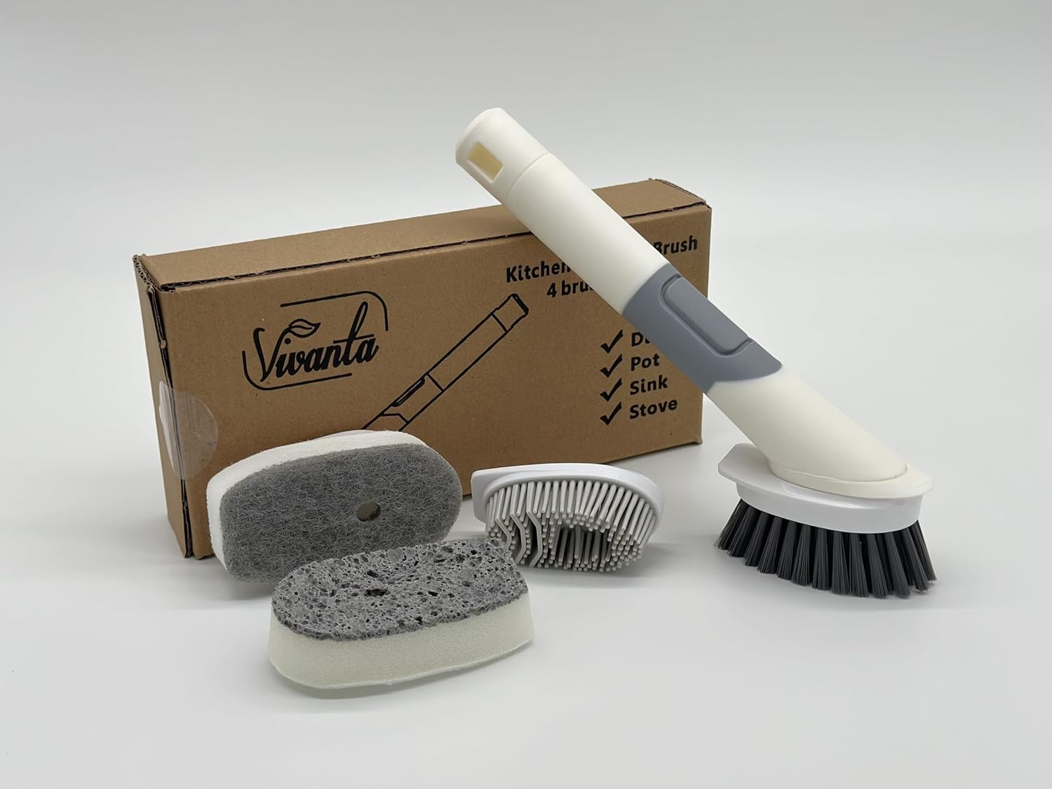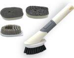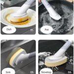 - 【Four (4 Replacement Brush Heads】: Includes four durable and interchangeable brush heads: > Perfect for stubborn grease and grime on pots and pans. > TPR brush head: Ideal for cleaning stovetops, sinks, and other surfaces. > Two sponge brush heads: Gentle yet effective for cleaning delicate items like bowls and glassware.